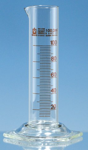 | General description【一般描述】 | Measuring cylinders, low form, short graduation marks. Made from DURAN®, calibrated to contain (TC, In). With spout and hexagonal base. Graduations and inscriptions in ETERNA amber duffusion stain, particularly resistant to aggressive cleaning methods. Tolerances according to DIN EN ISO 4788. |