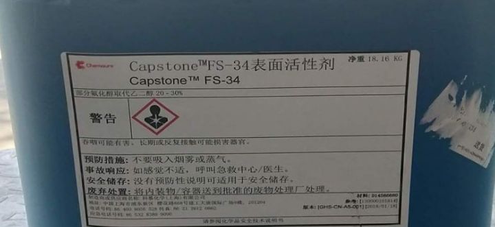 Capstone™FS-34不含任何VOC(挥发性有机化合物),不含APEO(烷基酚聚氧乙烯醚),非易燃品,可跟任何离子性的表面活性剂相容。