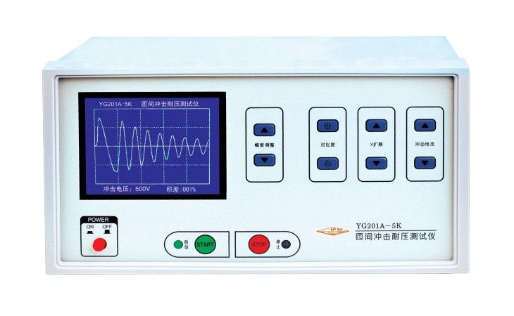 YG201系列匝间耐压测试仪采用“冲击波型比较法”,将具有规定峰值电压(一般是高于数倍的工作电压)加于被测线圈绕组上,通过比较两个震荡波形的差异。从而判断线圈匝间绝缘好坏,电晕放电,局部短路等各种故障均能直观的判断,两组被测线圈面积误差百分比显示,直观明了,避免了操作人员在观察波形时的人为误差,又能大大提高操作效率。